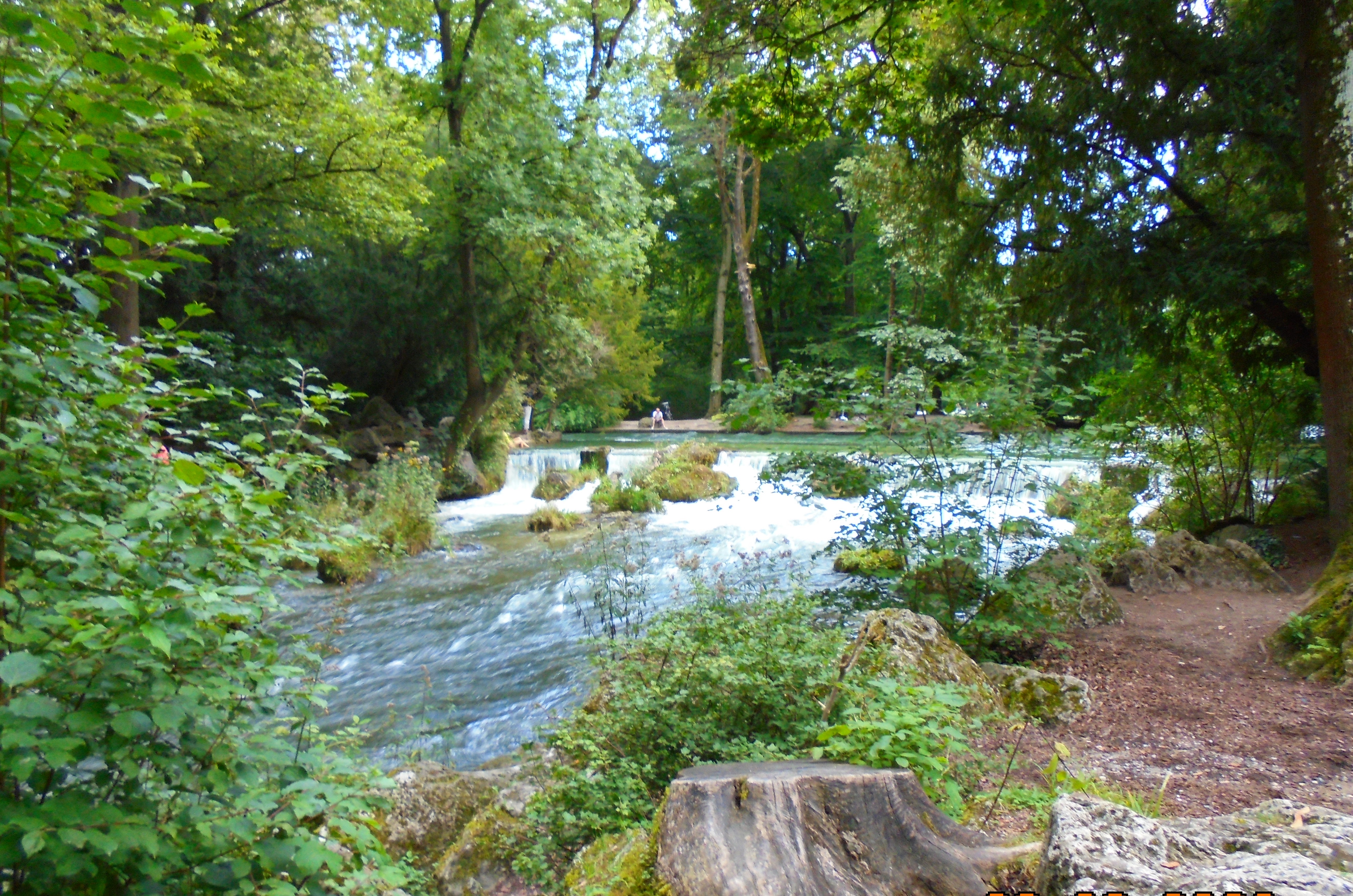° Für das rasche Dahinziehen der Gedanken (im querverlaufenden Eisbach mit seiner turbulenten Strömung und seinen kühnen Schwimmern)
