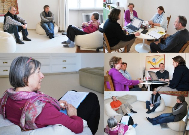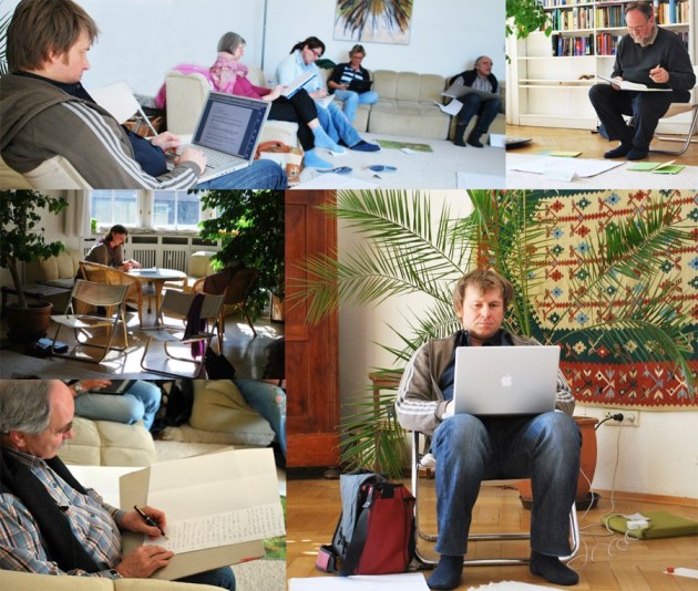 Hilfreich ist es für die Teilnehmer, sich zu ihren entstehenden Texte auszutauschen und über Ideen, Probleme und bereits Geschriebenes zu reden. Um diesen Austausch intensiver zu machen und jedem Gelegenheit zu geben, Fragen zu stellen oder Texte zu präsentieren, teilen wir dazu die Gruppe immer wieder in Kleingruppen (3-5 Teilnehmer) auf. Wer möchte, kann hier Texte vorlesen und Feedback und Anregungen bekommen.