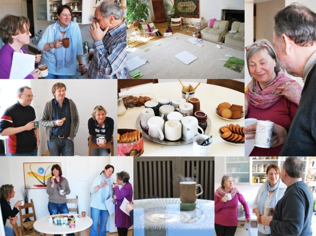Zeit zum gegenseitigen Kennenlernen und zum lockeren Gedankenaustausch bieten die Pausen zwischen den Sitzungen, die wir etwa alle 1,5 Stunden einlegen (wer ins Schreiben vertieft bleiben will, kann das gerne tun). Wir bieten Tee und Kekse an und der oder die Seminarleiter steht für Fragen zur Verfügung. Nach 15-20 Minuten geht es dann wieder ans Werk.